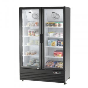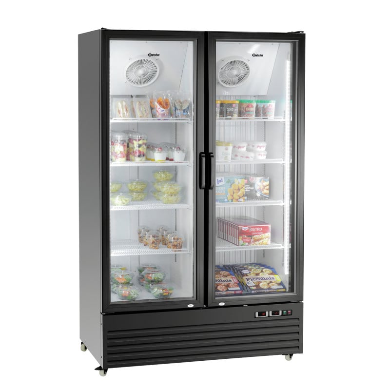 Ideal für Gastronomieprofis, dieser positiver und negativer Kühlschrank hat eine Kapazität von 820 Litern mit 2 Glastüren mit Scharnieren. Das Innere ist aus Kunststoff und das Äußere aus verzinktem Stahl. Er misst L 1215 x T 800 x H 2000 mm und verfügt über 4 schwenkbare Räder und 2 Räder mit Bremse. Es handelt sich um eine Kombination aus Kühlschrank und Gefrierschrank in einem ästhetischen schwarzen Design. Die Glastüren ermöglichen es, die Lebensmittel direkt zu sehen, die durch separat schaltbare LED-Beleuchtung hervorgehoben werden.