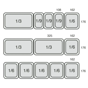 Mögliche Zusammensetzung für die Saladette (zusätzliche Halterungen können erforderlich sein): 1 GN-Behälter 1/3, 3 GN-Behälter 1/9 und 1 GN-Behälter 1/6 oder 2 GN-Behälter 1/3 und 1 Behälter 1/6 oder 5 GN-Behälter 1/6.