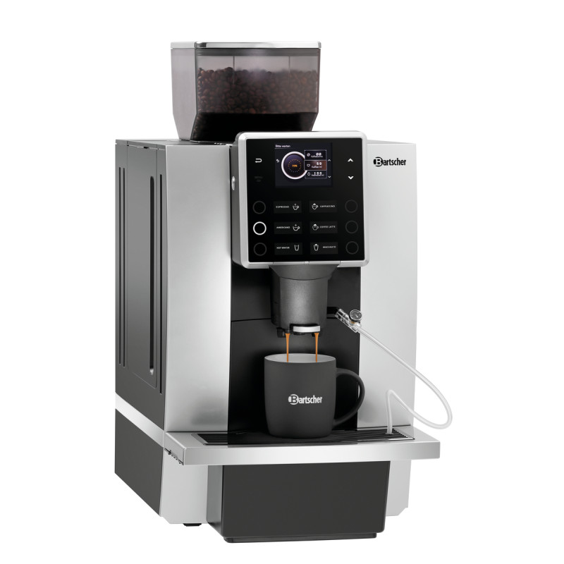 Additionally, you can adjust the height of the dispensing area to 3 levels: 90 mm, 130 mm, and 150 mm. You can also program 7 coffee doses for your drinks, and cup retention is possible for 6 coffee cups. With its control panel and graphic screen with photographic icons, you can dispense 8 drinks through direct selection. Equipped with an infrared port, this professional coffee machine has features for rinsing the coffee group, rinsing the cappuccinatore, descaling, and language selection accessible from the menu.