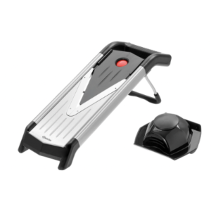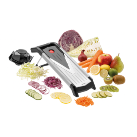 The mandoline comes with a series of versatile accessories: two accessories for grating and cutting sticks (3.5 mm and 7 mm) as well as three accessories for slicing (1.5 mm, 2.5 mm, and 3.5 mm), offering maximum flexibility according to the needs of each recipe. These options allow for various precise and uniform cuts, essential for the presentation and quality of the dishes.