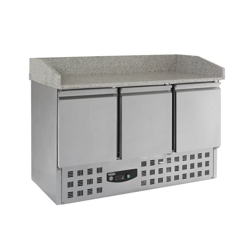Equip yourself with a functional, practical, and reliable work station, thanks to this high-end Polar two-door pizza counter. This preparation counter is compatible with patisserie format (600 x 400 mm) and features a powerful forced air cooling system, offering a large storage capacity and exceptional cooling performance for foods ready to be used at any time.