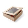 Ce Coffret à Thé a été conçu en Bois avec une fenêtre en acrylique et possède 12 compartiments. Ses dimensions sont de 300 x 280 x 90 mm.