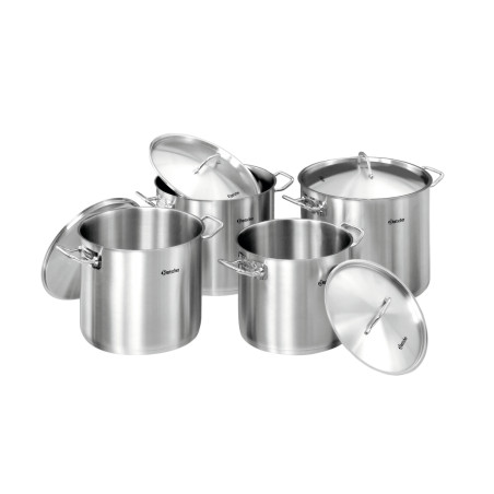 Ce set est composé de 4 marmites en acier inoxydable 18/10, avec bords verseurs et poignées isolées pour l'induction, le gaz et l'électrique.