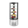 Vitrine de Présentation Pâtisserie Ronde dune contenance de 360 L conçue en inox et en double vitrage en verre trempé. la porte est dotée d'une fermeture automatique. Elle possède 4 étagères en verre à hauteur réglable et un éclairage intérieur. Plage de température comprise entre 2 et 8°C.